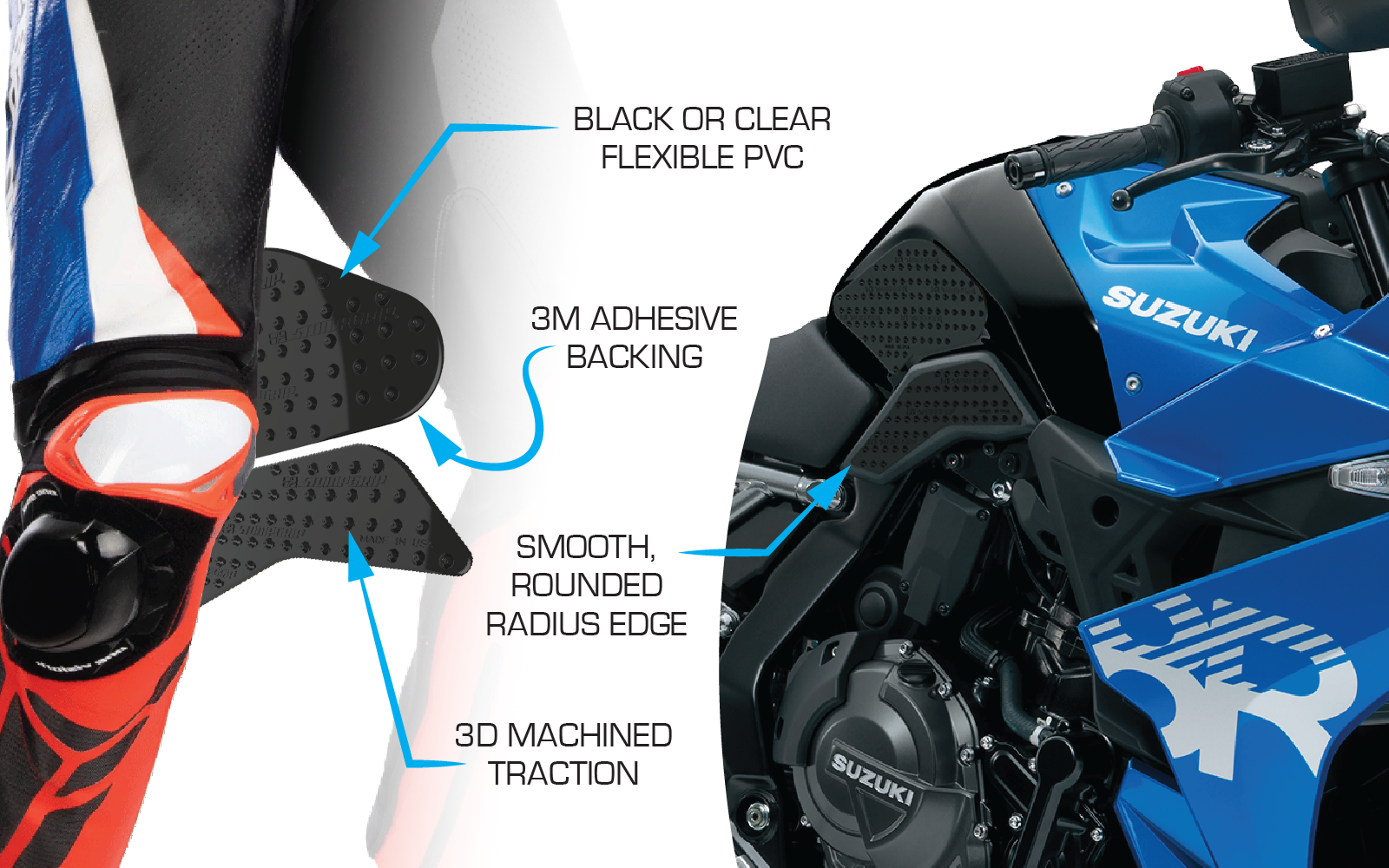 • Increase overall control of the motorcycle by locking knees into tanks.